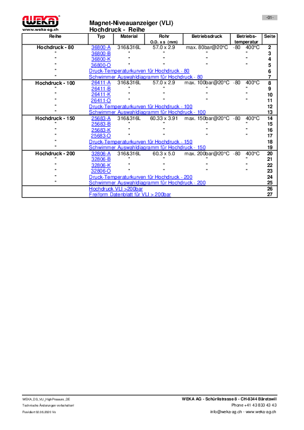 The HighPressureLine is the standard for operating pressures from 50 bar to 200 bar and operating temperatures up to 400°C. While many manufacturers can only offer special productions in the high pressure range, WEKA feels particularly at home in this segment and offers four staggered series (80/100/150/200 bar) as standard.