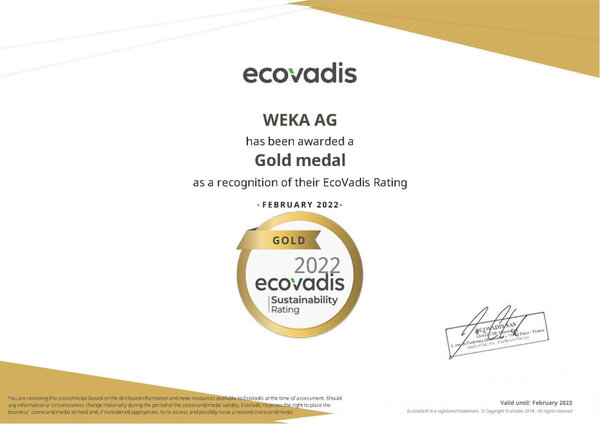 Dass die WEKA AG mit ihrer Nachhaltigkeitsstrategie erfolgreich unterwegs ist, zeigt die wiederholt, höchste Auszeichnung durch das unabhängige Prüfunternehmen Eco Vadis: Die WEKA AG erhält erneut die Goldmedaille und gelangt mit 67 erzielten Punkten für ihre Corporate Social Responsability (CSR) in die höchste Kategorie.