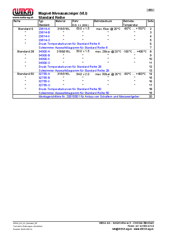 Das WEKA Stabmagnet-Prinzip ermöglicht eine Vielzahl von Schwimmertypen für unterschiedlichste Parameter. Die StandardLine umfasst drei Druckstufen (6/28/50 bar) mit EN- und ANSI-Anschlüssen im Standard – ob Flansche, Gewinde oder Schweißenden. Nach europäischer DGRL oder amerikanischem ANSI/ASME Standard gefertigt.